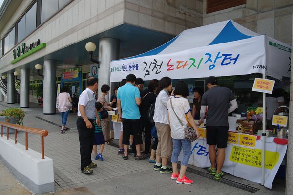 이번 행사에는 포도덩굴농원(대표 윤재술), 도화농부(대표 전동임)등 9농가가 “믿을 수 있는 농부들 김천노다지장터” 슬로건을 걸고 지역농특산물 홍보· 판매를 실시하여 소비자들에게 큰 호응과 더불어 많은 매출을 올렸다.