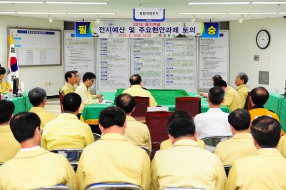 |  | | | ⓒ 김천내일신문 | | 김천시(시장 박보생)는 지난 8월19일 오후 시청 지하종합상황실에서 “평화시장 및 인근주택지 방화발생”이라는 주제를 설정하고 김천시와 군부대, 경찰, 소방서, 한전 김천지사, KT 김천지점 등 유관기관이 참석한 가운데 2014 을지연습 전시 주요현안토의과제 보고회를 개최했다.