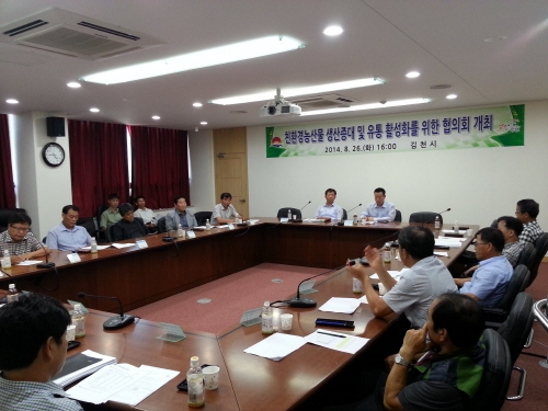 |  | | | ⓒ 김천내일신문 | | 김천시(시장 박보생)에서는 지난 8월 26일 농업기술센터에서 김천시 친환경농업인연합회장, 쌀전업농김천시연합회장, 친환경농산물 취급자인증 농협장(아포농협, 농소농협, 새김천농협, 구성농협, 김천농협), 농업기술센터소장 및 관계 행정기관이 참여하여『친환경농산물 생산증대 및 유통활성화』를 위한 협의회를 개최하였다.