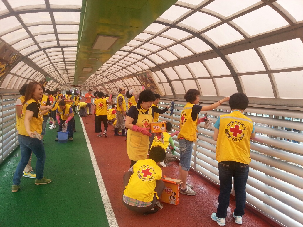 |  | | | ⓒ 김천내일신문 | | 김천시(시장 박보생)는 지난 9월 2일 전국에서 가장 긴 육교로 알려진 김천 역 앞의 “평화육교”를 대한적십자 봉사회(김천지구협의회 회장 서성숙) 회원 50여명과 함께 도로보수원을 동원하여 추석맞이 대 청소를 실시했다. 이는 우리민족 최대 명절인 한가위를 맞이하여 고향을 찾는 귀성객이나 관광객의 깨끗한 김천의 이미지를 주기 위해 매년 실시하고 있다.