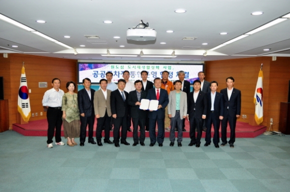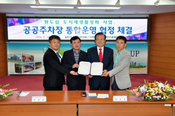 |  | | | ⓒ 김천내일신문 | | 김천시청 2층 회의실에서 9월18일 김천시, 농협중앙회, 신한은행, 평화상가로협의회, 도시재생 주민협의체가 한자리에 모여 원도심 도시재생활성화를 위한 공공주차장 통합운영 협정을 체결 하였다.