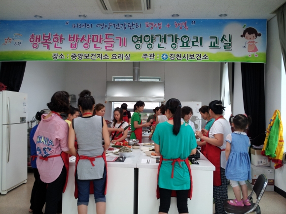 |  | | | ⓒ 김천내일신문 | | 김천시(시장 박보생)는『행복한 밥상만들기』라는 슬로건을 걸고 2014년 8월 ~ 9월에 걸처 다문화가정, 비만환자, 지역아동센터 어린이, 임산부 및 영유아 등 320여명을 대상으로 영양건강요리교실을 운영했다. 요리실습 내용으로는 맞춤형 건강요리로 다문화가정은 구절판, 견과류 멸치뽂음, 비만환자와 고혈압 및 당뇨병환자는 저칼로리 저염식요리인 닭가슴살샐러드와 호박샌드위치, 그리고 임산부는 소고기안심말이와 탕평채, 지역아동센터 어린이는 야채샌드위치와 바나나음료 만들기 등 다양한 영양건강요리를 만들어 봄으로서 대상자들에게 좋은 반응을 얻고 있다.