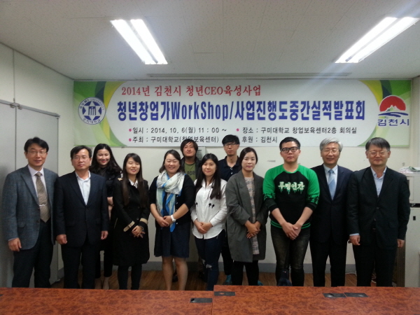 |  | | | ⓒ 김천내일신문 | | 구미대학교(창업보육센터)가 주관하고 김천시가 후원하는 「2014 김천시 청년창업가 워크숍 및 중간실적발표회」가 지난 10월 6일 오전 구미대학교 창업보육센터 2층 회의실에서 개최하였다. 이번 발표회는 창업활동 분위기 조성 및 청년창업가간 경쟁심 유발을 통한 창업성공율 제고와 청년창업가들이 자신들의 사업성과 발표를 통하여 향후 CEO의 자질을 함양하고자 실시된다.