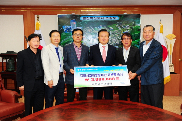 지역인재의 육성과 김천 교육발전을 위해 지난10월29일 2층 접견실에서 나정국 김천과수연합회장과 임원들은 3백만 원을 인재양성재단에 기탁하면서 “항상 농업에 많은 관심과 적극적인 지원을 아끼지 않는 시장님 덕분에 과수연합회가 기반을 잘 다져가고 있다.” “회원들 모두가 김천의 미래를 위한 인재양성에 일익을 담당하자는데 공감대를 형성하여 작은 금액이지만 기탁하게 되었다”고 겸손해 하였다.