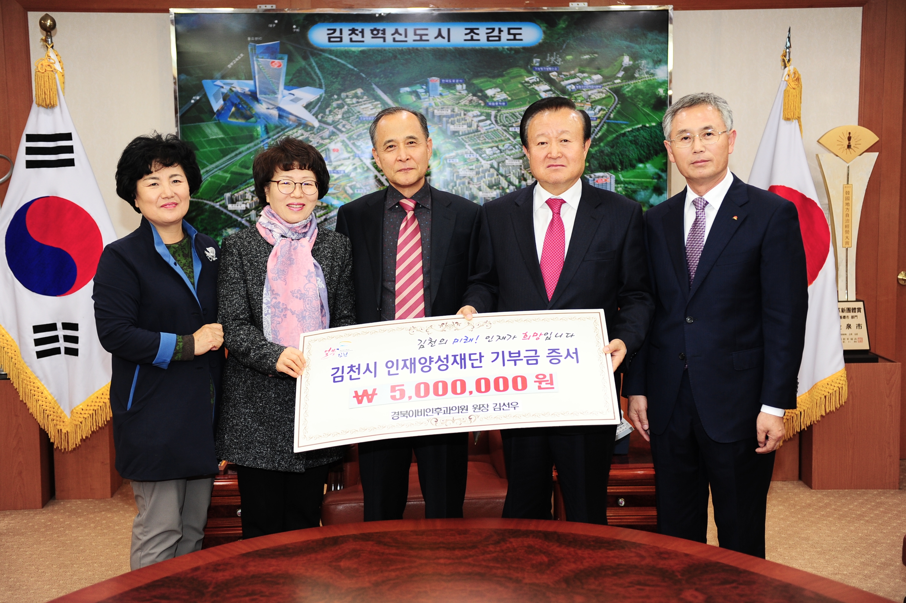 11월 3일 김선우 경북이비인후과의원 원장(김천시자원봉사센터 이사장)은 “예전부터 김천의 미래를 이끌어갈 인재육성에 많은 관심을 가지고 있었다. 지금에서나마 적은 금액 이지만 인재육성에 보탬이 되고자 김천시인재양성재단에 5백만원을 기탁하게 됐다”고 말했다.