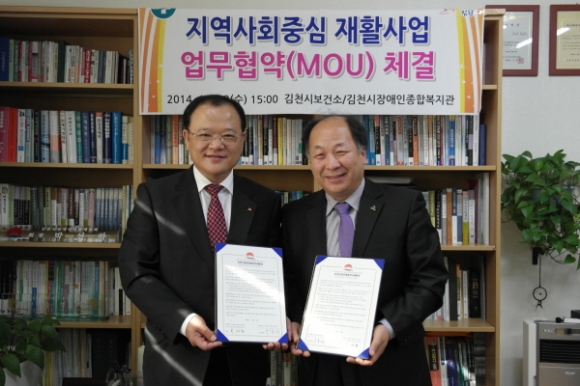 |  | | | ⓒ 김천내일신문 | | 김천시보건소(소장 우문경)는 지난 11월 12일 김천시장애인종합복지관장실에서 『지역사회중심재활사업 업무협약(MOU)』을 체결하고 장애인의 건강증진 및 사회적 지지기반 확립을 위해 협력키로 하였다.