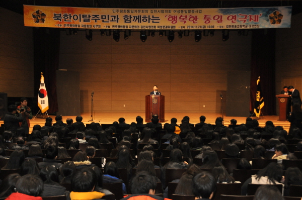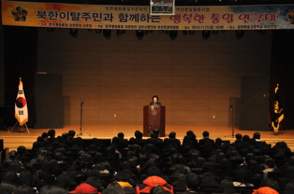 |  | | | ⓒ 김천내일신문 | | 민주평화통일 자문회의 김천시협의회(회장 최용남) 여성분과위원회(위원장 배영애)는 11월21일 예술고등학교 대공연장에서 “통일시대를 열어가는 미래 꿈나무들”이라는 행복 연극공연제를 개최했다.