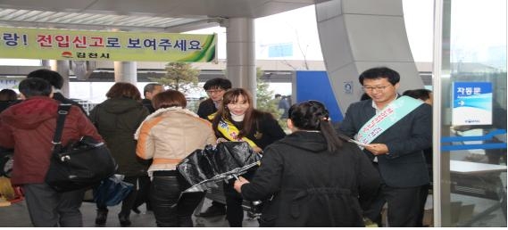 월요일 아침 출근시간대 이전기관 임직원들이 KTX이용객 수요가 많은 점에 착안해 “김천사랑 ! 전입신고로 보여주세요” 등의 내용이 적힌 리플릿과 이른 아침 식사를 거른 임직원들을 위해 떡을 준비하여 나눠 주며 김천으로 주소를 옮길 것을 간곡히 호소해 눈길을 끌었다.