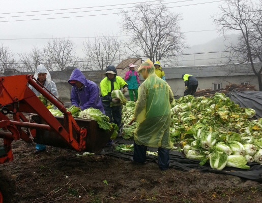 이날 많은 비가 내리는 궂은 날씨에도 불구하고 30여명의 회원들이 참여한 가운데, 저마다 우의를 갖추어 입고 많은 양의 배추를 뽑고 준비된 차량에 싣기 위해 구슬땀을 흘렸다.