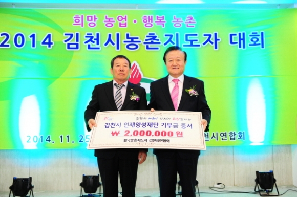 11월 25일 김천 컨벤션에서 김천시 농촌지도자대회 행사 시 노인두 한국농촌지도자 김천시연합회 회장은 박보생 재단 이사장에게 장학기금을 전달했다.