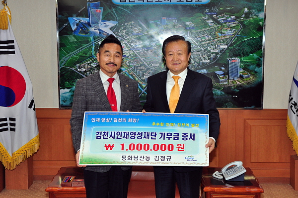|  | | | ⓒ 김천내일신문 | | 김천의 교육발전과 글로벌 인재육성을 위해 평화남산동 주민 김청규씨가 김천시인재양성재단(이사장 박보생)에 장학기금 100만원을 기탁했다.