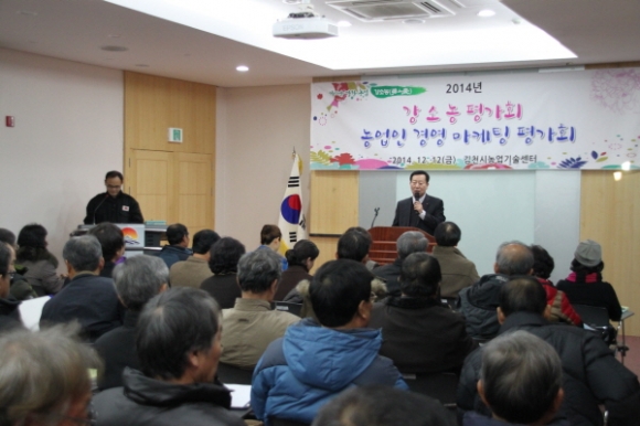 |  | | | ⓒ 김천내일신문 | | 김천시(시장 박보생)는 12월 12일 농업기술센터 소회의실에서 80여명의 농업인이 참석한 가운데 2014년 강소농 육성사업 평가회를 가졌다.