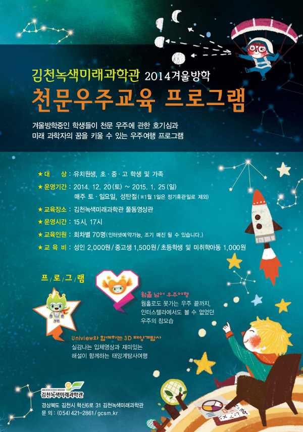|  | | | ⓒ 김천내일신문 | | 김천녹색미래과학관은 겨울방학을 맞은 초․중․고 학생들을 대상으로 천문우주교육프로그램을 실시한다. 과학관의 4D풀돔영상관에 설치된 3D 우주시뮬레이션 프로그램 유니뷰(Uniview)시스템을 활용하여 실감나는 3D우주영상을 만날 수 있다. 교육 내용은 지구를 출발해서 다양한 외계의 은하와 성단, 성운을 둘러보고 우주의 끝까지 체험해볼 수 있는 【웜홀을 넘어 우주여행】과 가까운 태양과 행성들의 구석구석을 둘러 볼 수 있는 【Uniview와 함께하는 3D 태양계 탐사】 프로그램으로 구성되어 있으며 3D영상과 천문우주 전문가의 맛깔나는 해설이 곁들여질 예정이다.