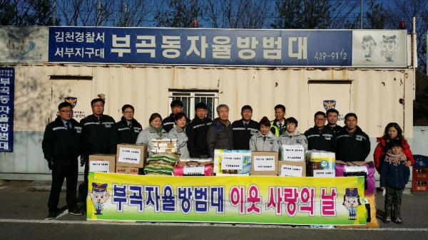 |  | | | ⓒ 김천내일신문 | | 부곡자율방범대(대장 이선득)에서는 지난 12월 14일 대곡동에 거주하는 소외된 이웃주민들과 함께하는 연말을 보내기 위해 다양한 위문품을 전달했다. 전달된 위문품은 회원들이 매월 납입한 회비를 모아 구입한 것으로 쌀, 휴지, 이불, 라면, 우유, 밀가루 등을 전달하였다. 부곡자율방범대장(이선득)은 “추운 날씨에 불우 이웃과 함께 하는 시간을 가지게 돼서 매우 뜻 깊다”며 앞으로도 계속적으로 불우 이웃과 함께 하겠다고 밝혔다. 부곡자율방범대는 매년 추운 계절에 불우이웃을 위해 조금이나마 보탬이 되길 바라는마음으로 위문품을 전달한다.
