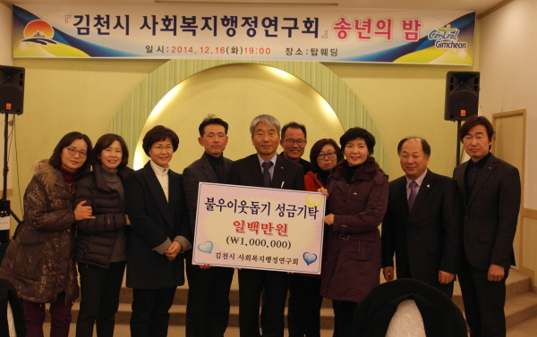 김천시 사회복지직 공무원 60여명으로 구성된 사회복지행정연구회는 해마다 연말을 맞아 불우이웃돕기성금을 기탁하고 있으며, 올해는 지난 12월 16일 송년모임에서 회원 모두의 뜻을 모아 마련한 성금을 기탁했다.