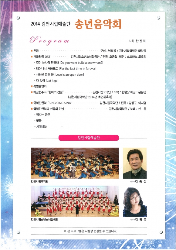 |  | | | ⓒ 김천내일신문 | | 오는 12월 30일 김천시문화예술회관 대공연장에서 갑오년 한해를 마무리하는 김천시립예술단『송년음악회』를 개최한다.