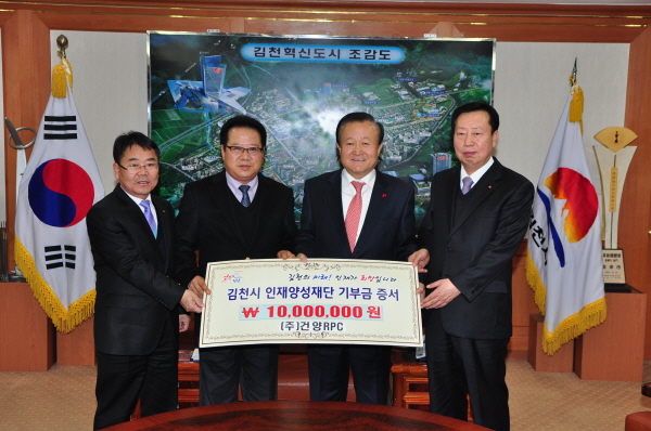 |  | | | ⓒ 김천내일신문 | | 지역의 우수한 인재양성과 교육환경개선을 목적으로 설립한 김천시인재양성재단에 후원금 기탁이 줄을 잇고 있는 가운데 12월 19일에는 (주)건양RPC 이건우대표가 1천만원의 기금을 기탁했다.