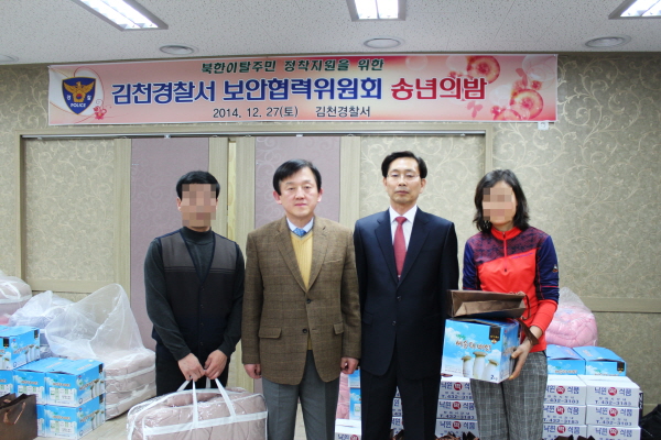 김천경찰서(서장김훈찬) 보안협력위원회(위원장여상규)는 지난해12월27일 보안협력위원, 북한이탈주민 26세대를 초청하여 보안협력위원회에서 준비한 이불세트와 새송이버섯 등을 전달하면서 다사다난했던 한해를 마무리하는『2014년 김천경찰서 보안협력위원회 북한이탈주민 송년의 밤』을 개최했다.