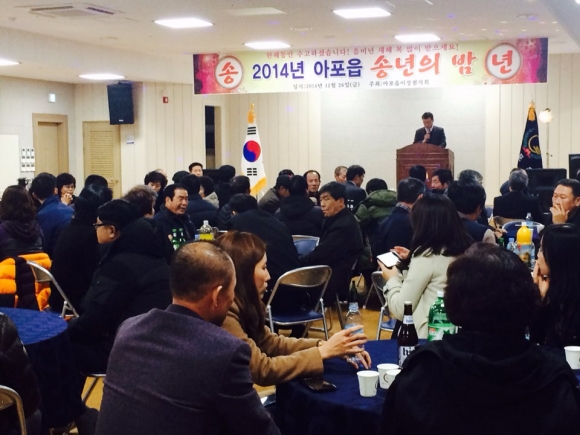 |  | | | ⓒ 김천내일신문 | | 김천시 아포읍(읍장 김병진)에서는 지난 12월 26일 아포종합복지관 강당에서 최원호 시의회 부의장, 각 이장, 관내 기관장 등 100여명이 참석한 가운데 아포읍민 화합 송년의 밤 행사를 갖고 가는 청마의 해를 아쉬워하며, 을미년 청양의 해를 맞이하는 각오를 다지는 시간을 가졌다.