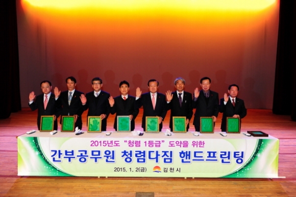 김천시(시장 박보생)는 2015년 1월2일 문화예술회관 대공연장에서 개최된 2015년도 시무식에서 ‘청향만리(淸香萬里) 프로젝트’ 추진의 일환으로 ‘청렴 1등급’ 도약을 위한 청렴 및 친절실천 결의대회와 더불어 간부공무원 청렴다짐 핸드프린팅 행사를 개최했다.