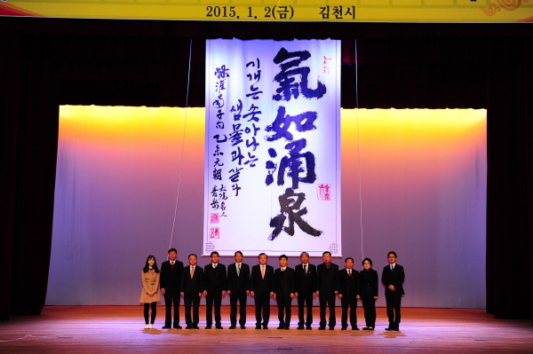 박보생 시장은 “2015년은 민선6기를 맞아 우리시가 내부로는 소통하고, 외형적으로는 혁신도시, 산업단지, 남부내륙철도 건설 등 새로운 변화와 개혁을 선도하며 행복도시 김천의 미래 100년을 만들어 나가는 기운이 샘물처럼 솟아나기를 기원하는 의미에서 ‘氣如涌泉(기여용천)' 을 새해 화두로 선정했다”고 말했다.