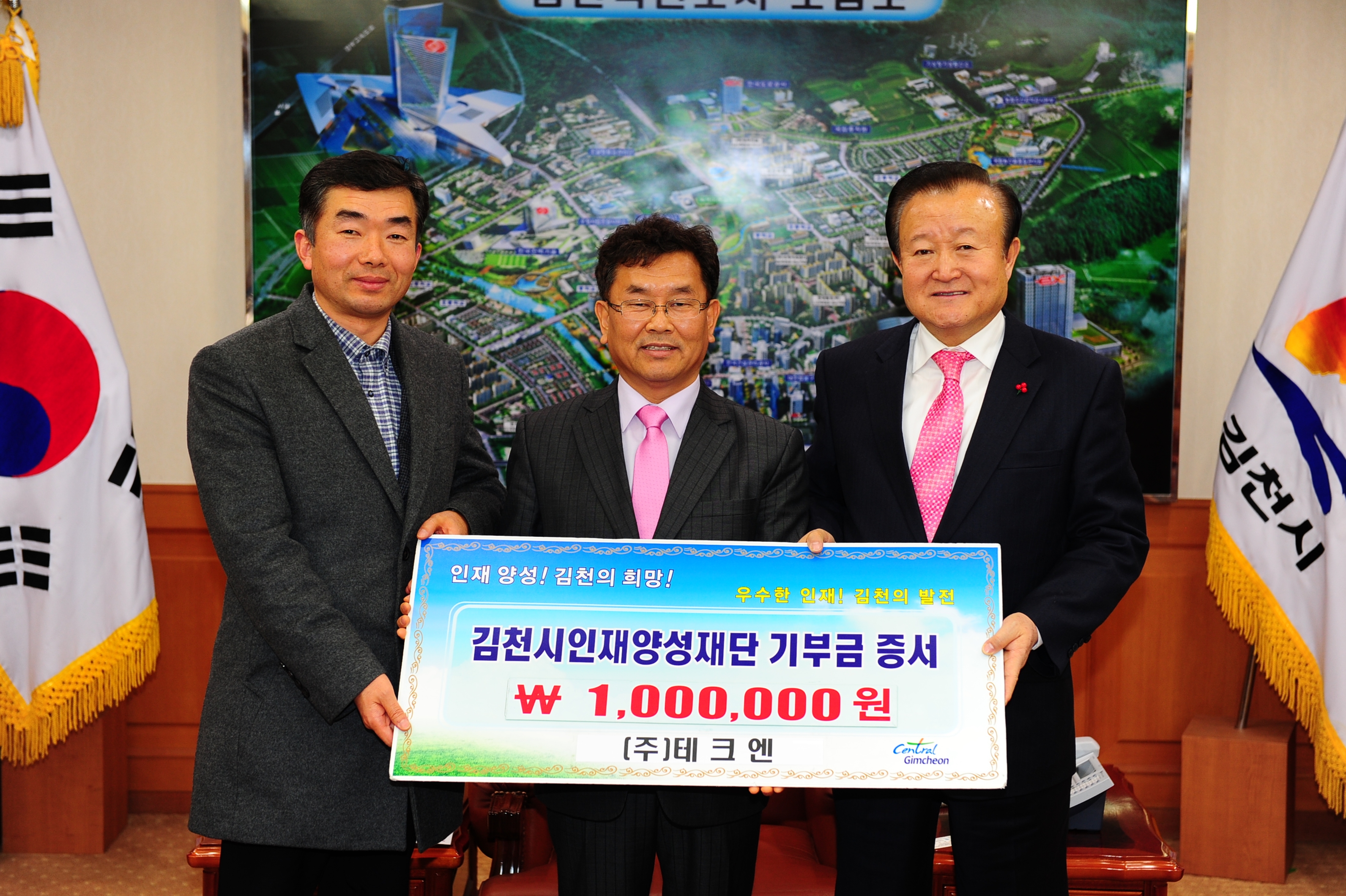지난 1월 7일 이영섭 (주)테크엔 대표는 “김천의 LED조명사업에 큰 도움을 준 김천시에 조금이나마 보탬이 되고자 김천시인재양성재단에 1백만원을 기탁하게 됐다고 말했다.