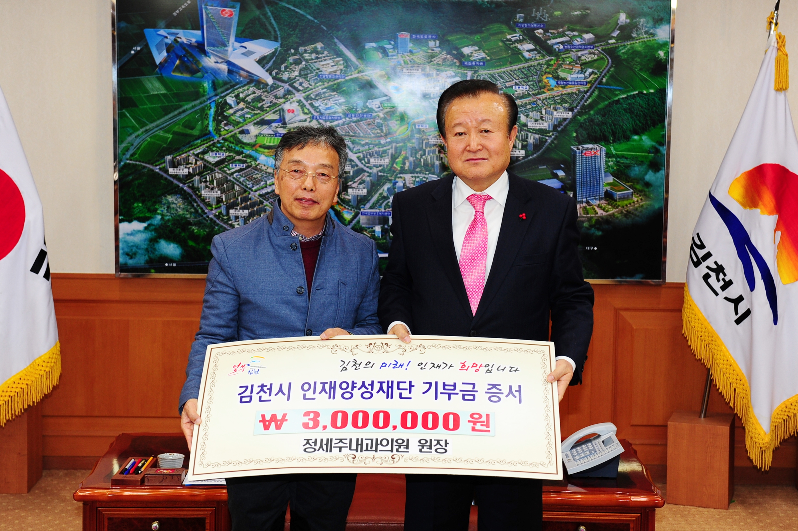 |  | | | ⓒ 김천내일신문 | | 김천의 교육발전과 글로벌 인재육성을 위해 정세주 내과의원에서 김천시인재양성재단(이사장 박보생)에 장학기금 3백만원을 기탁했다.