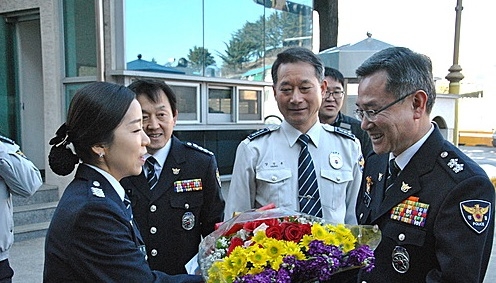 김 청장은 김천경찰서에 도착해 김훈찬 서장, 양진봉 경무과장과 인사를 나눈 뒤 박윤정(여청계) 경사로부터 방문 축하 꽃다발을 받았다.