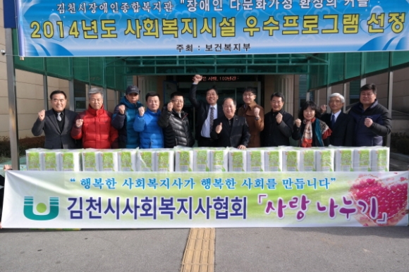 김천시사회복지사협회(회장 박선하)는 지난 1월 13일 장애인종합복지관 현관 앞에서 사랑의 이웃돕기 위문품을 전달하였다.