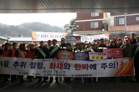 김천시(시장 박보생)는 지난 1월13일 제226차 안전점검의 날을 맞아 경상북도, 김천소방서와 합동으로 재난안전네트워크 단체 회원 150여명이 참석한 가운데 평화시장에서 겨울철 화재예방 및 한파 대비 캠페인을 전개했다.