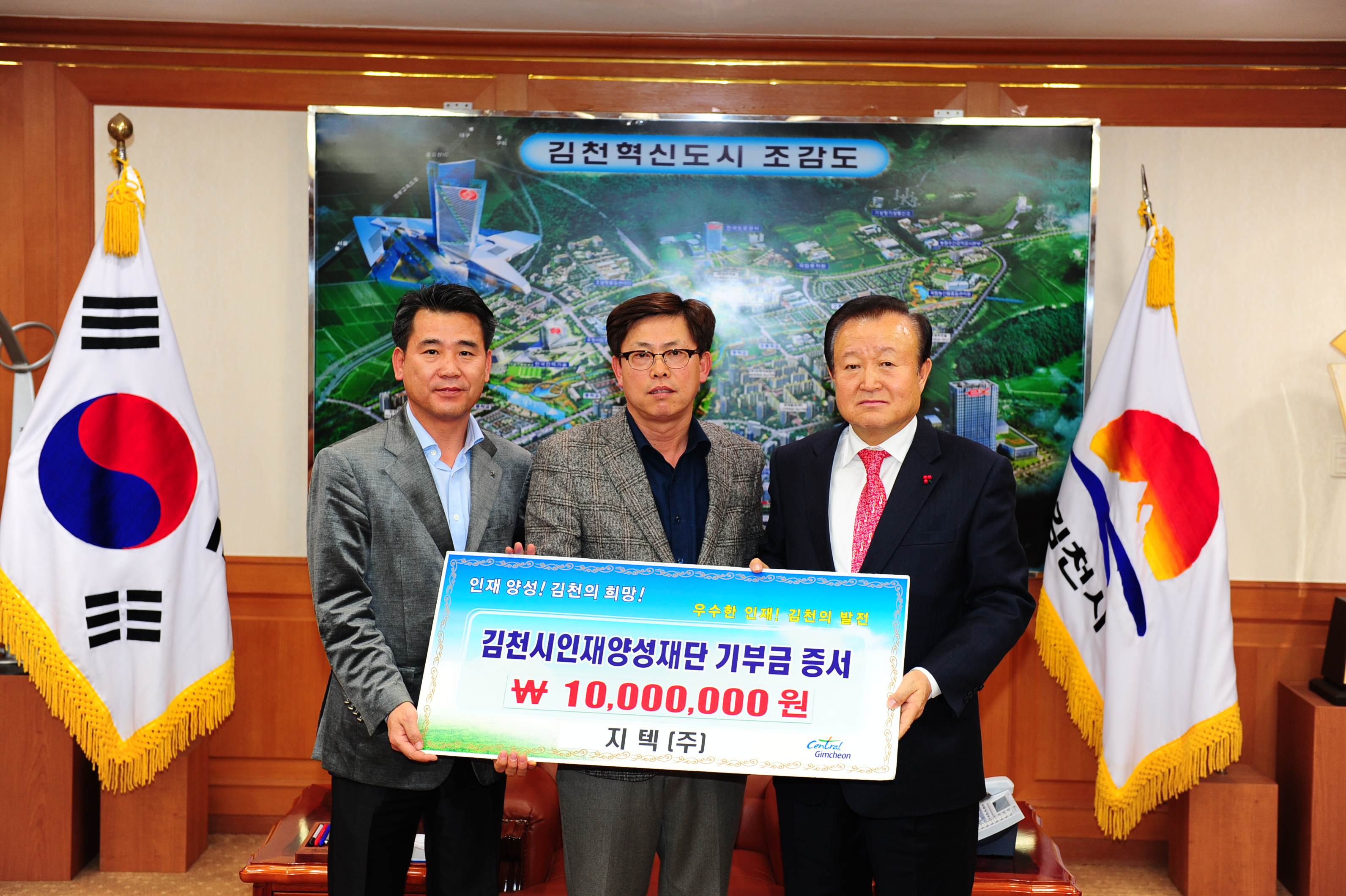 지난 1월 30일 접견실에서 유해귀 지텍(주)의 대표는 “김천에서 사업을 하면서 많은 도움을 받았으며 그 고마운 마음을 담아 김천시인재양성재단에 1천만원의 후원금을 기탁하게 됐다.”고 말했다.