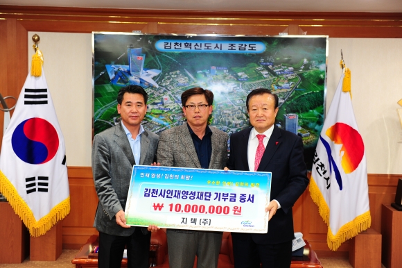 |  | | | ⓒ 김천내일신문 | | 김천의 교육발전과 글로벌 인재육성을 위해 지텍(주)(대표 유해귀)에서 김천시인재양성재단(이사장 박보생)에 장학기금 1천만원을 기탁했다.