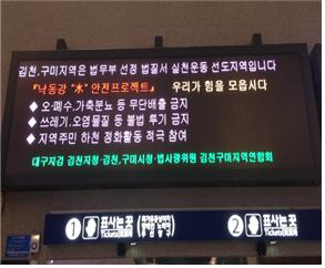 이에 김천지청은 법무부 추진 ‘범국민 법질서 실천운동’의 일환으로, 지역맞춤형 수질 안전법규 준수운동인《낙동강 “水” 안전프로젝트》를 법무부에 먼저 제안하여, ’2014. 7. 수질안전 선도지역으로 선정되었다.