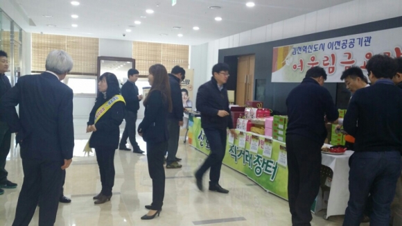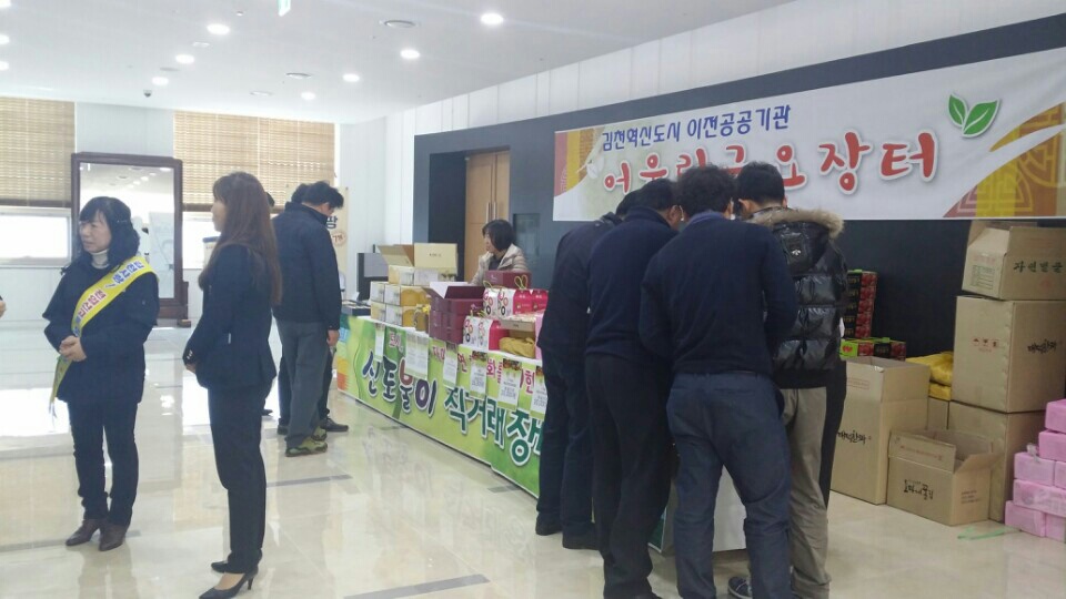 |  | | | ⓒ 김천내일신문 | | 김천시(시장 박보생)는 지난 2월 6일 김천혁신도시 교통안전공단 신사옥에서 어울림 금요장터를 열어 이전기관과 농가 간 상생의 자리를 마련했다. 이번 행사는 교통안전공단의 요청으로 설을 맞아 직거래장터를 통해 판로개척에 어려움을 겪고 있는 농가에 희망을 주고 혁신도시 이전기관 직원들에게 김천의 우수 농특산물을 저렴하게 구입할 수 있는 기회를 제공하고자 마련되었다.