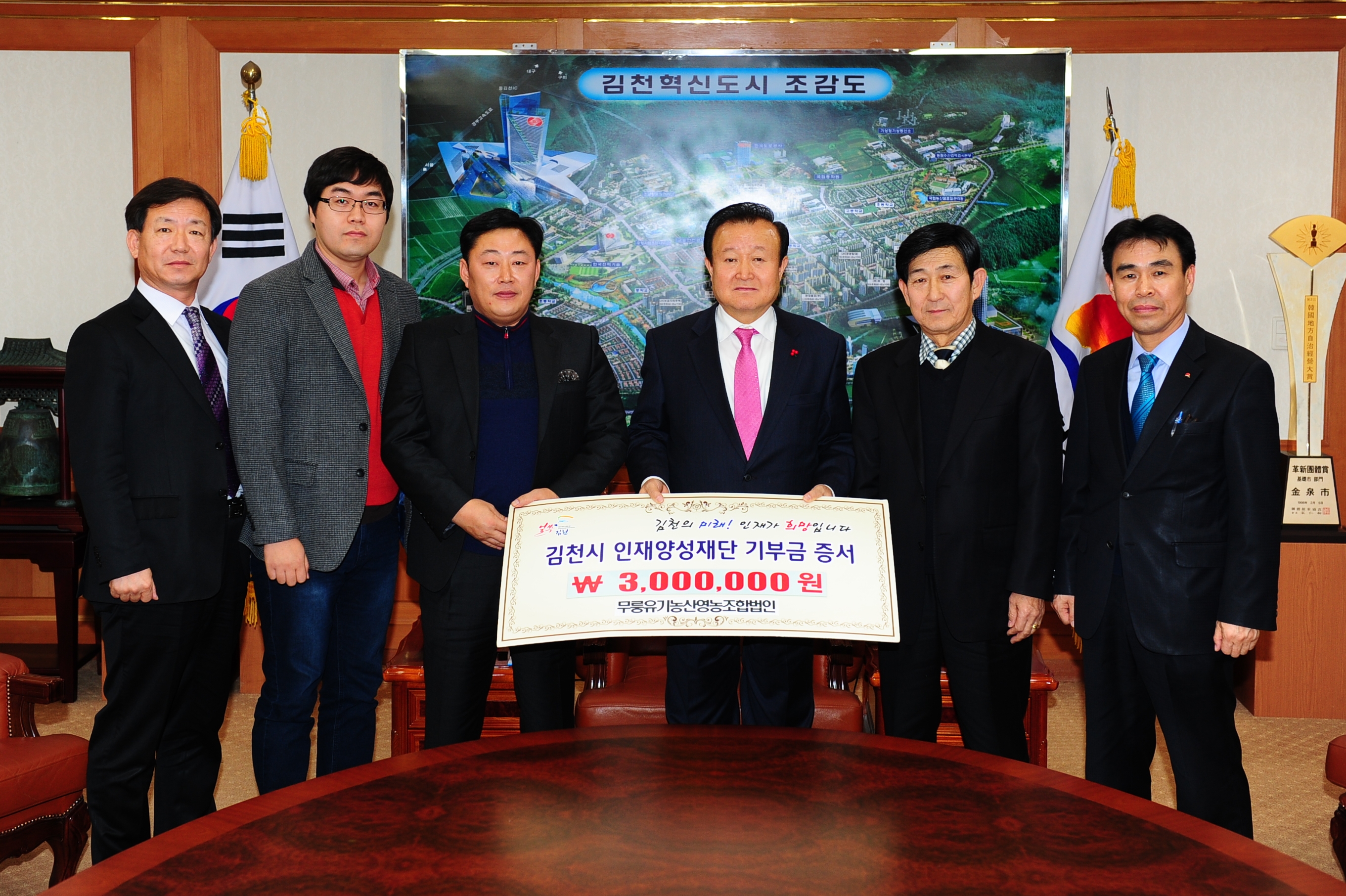 |  | | | ⓒ 김천내일신문 | | 구성면 구미리에 소재하고 있는 무릉유기농산영농조합법인(사장 박종철)이 지난 2월 6일 김천시인재양성재단(이사장 박보생)에 장학기금 3백만원을 전달했다.