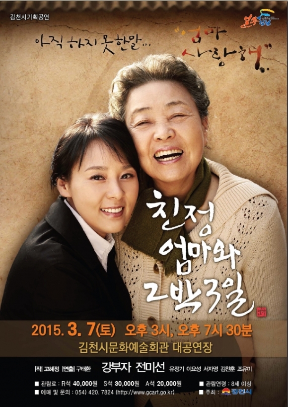 |  | | | ⓒ 김천내일신문 | | 김천시(시장 박보생)는 따뜻함과 가슴 뭉클한 감동으로 공연계에 ″엄마 신드롬″ 을 몰고 온 연극′친정엄마와 2박3일'을 3월 7일(토) 오후3시, 7시30분 두 차레에 걸쳐 김천시문화예술회관 대공연장에서 공연한다.