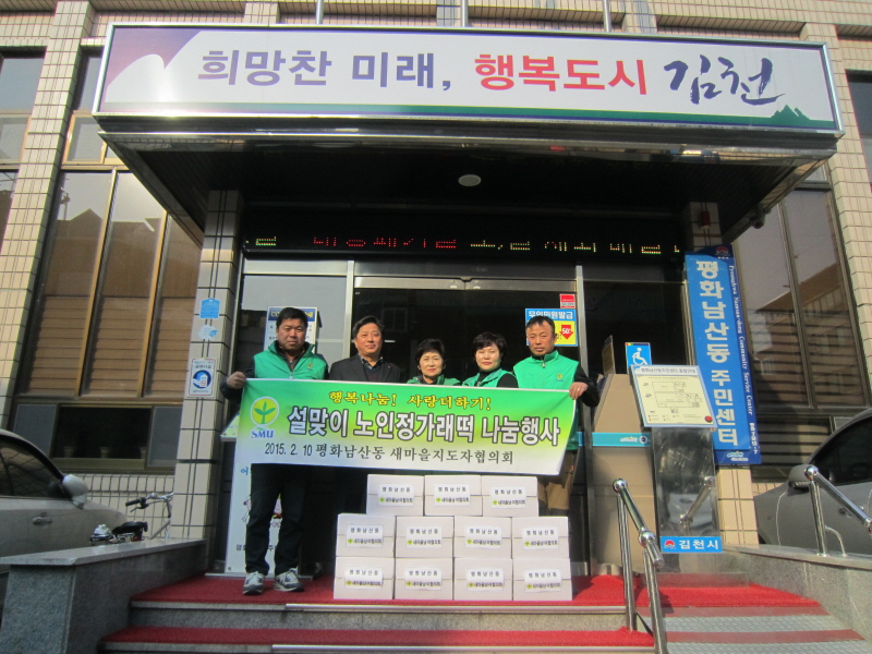 신장호 동장은 작은 마음을 모아 큰 행복을 만들고자하는 새마을지도자회원들의 정성과 뜻이 살기 좋고 아름다운 평화남산동을 이끌어가는 원동력이라며 감사의 인사를 전하고 주민 모두가 어느 해 보다 더 즐겁고 행복한 설 명절이 되기를 기원했다.