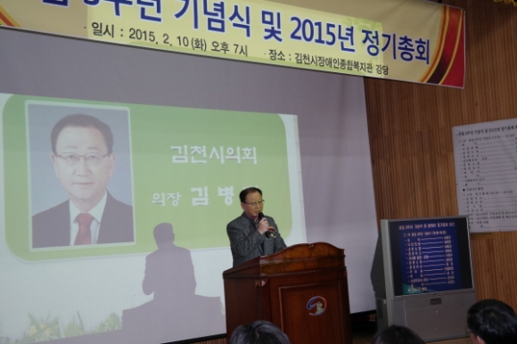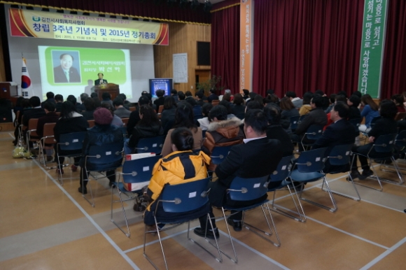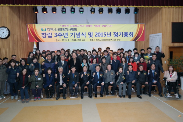 김천시 사회복지사협회(회장 박선하)는 지난 2월 10일 김천시장애인종합복지관 3층 강당에서 창립 3주년 기념식 및 2015년 정기총회를 개최했다. 이날 기념식에는 이준상 경북사회복지사협회장, 박보생 김천시장, 김병철 김천시의회 의장, 경상북도의회 김응규, 나기보, 배영애 의원, 이기양 김천시지역복지협의체 공동위원장, 새누리당 김천시당 황상연 사무국장, 박선하 회장을 비롯한 100여명의 사회복지사들이 참석하였다.