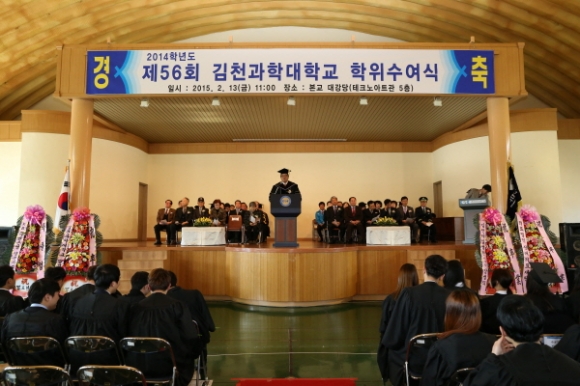 김천과학대학교(총장 이은직)는 지난2월13일 교내 테크노아트관 대강당에서 양산학원 편군자 이사장과 배낙호 시의회의장을 비롯한 각계 인사와 학부모, 학생 등 1,500여 명이 참석한 가운데 제56회 학위수여식을 개최했다.