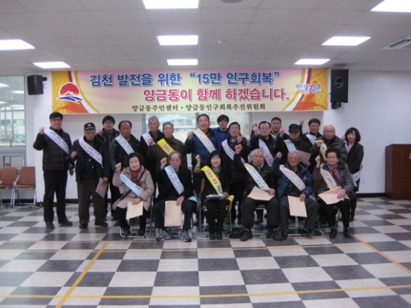 |  | | | ⓒ 김천내일신문 | | 양금동주민센터(동장 장귀희)는 지난 2월 16일 주민센터 +회의실에서「15만 인구회복 운동」의 효율적인 추진을 위한 양금동 노인회 회의를 열고 인구증가 시책에 동참할 것을 결의했다.