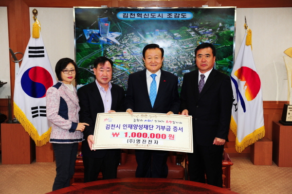 지난 2월 25일 접견실에서 오경석 (주)명진전자 대표는 “기업의 수익을 사회로 환원하고자 김천시인재양성재단에 1백만원을 기탁하게 됐다.”고 말했다.
