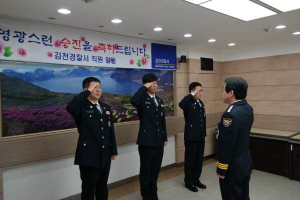 김천경찰서(서장 김훈찬)는 3월 2일 2층 열린방에서 경찰서장, 과, 계장, 승진자 가족들이 참석한 가운데 승진 임용식을 개최 하였다