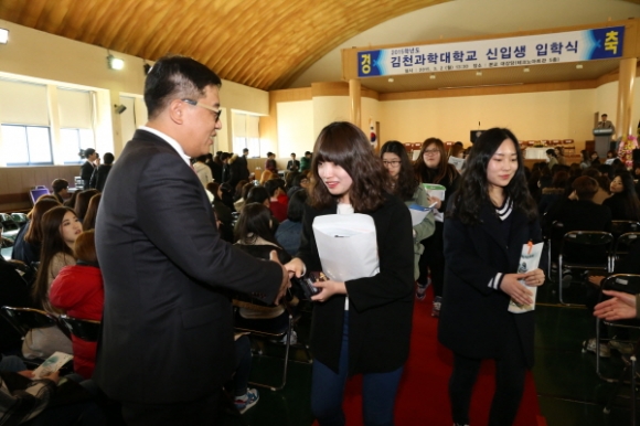 김천과학대학교(총장 이은직)는 2일 교내 테크노아트관 대강당에서 신입생, 학부모 등 1,000여 명이 참석한 가운데 ‘2015학년도 입학식’을 가졌다.