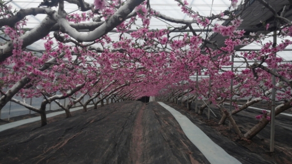 시설복숭아는 지난 1월 초순부터 가온을 시작하여 2월 중순경부터 개화를 시작하여 3월 2일 만개되어 5월 중순경 수확 예정에 있다. 금년도는 2월달 기상호조로 전년보다 4 ~ 5일 일찍 만개하였다.