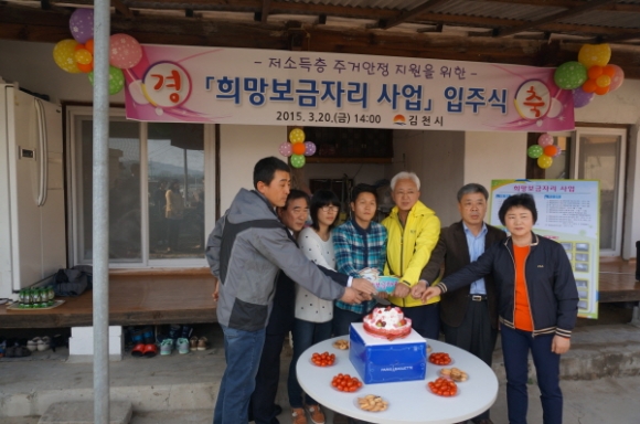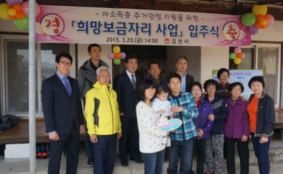 ‘희망보금자리’가 지금은 깨끗하고 단정해서 새 집과 같지만, 불과 세 달 전 희망보금자리 사업대상지로 선정될 2014년 12월 초만 해도 너무 오랫동안 사람이 살지 않아 폐가와 같은 모습이었다. 김천시에서는 저소득층의 주거공간으로 사용하기 위해 집주인의 허락을 받아 무상임대차 계약을 하고, 김천시 주거복지센터 한마루건축(대표 이성우)과 공사계약을 체결하여 1천만원(시비)의 예산으로 집수리공사(보일러 교체, 입식부엌, 화장실 개선 공사, 도배 및 장판)를 실시하였으며, 1월 중순 공사가 마무리된 후 나머지 집수리는 김천시자원봉사센터의 청소봉사와 유한킴벌리 봉사단체의 도움(외부벽면의 도색작업, 오래된 전기 배선 수리, LED 등 교체작업 및 보일러 난방유 지원)으로 올해 2월 초 지금의 아늑하고 따뜻한 희망보금자리가 되었다. 희망보금자리에서 살게 된 가족은 모두 6명(부모, 자녀 4명)으로 강원도 속초에서 어렵게 생활하다가 세대주 김 모씨가 김천시 관내 회사에 취업을 하게 되면서 서로 떨어져서 지내다가 희망복지지원단의 사례관리사에 의해 ‘희망보금자리’ 입주대상자로 추천되어 집수리가 마무리된 후 나머지 가족 모두 김천으로 이사 오게 되었다. 희망보금자리의 첫 번째 주인이 된 김 모씨는 “낯선 고장에 와서 어떻게 살아가야 할지 막막했는데 강원도에 살던 집이 월세가 끝나갈 무렵 가족들과 함께 살아갈 수 있는 희망보금자리로 오게 되어 마음도 안정되고 기쁘다. 처음에 집을 봤을 때와는 너무 달라진 지금의 집을 보고 이 곳에 오래 살고 싶은 마음이 생겼다. 희망보금자리를 위해 도움을 주신 분들께 감사드리며, 열심히 살아서 언젠가는 우리가족도 누군가에게 도움을 줄 수 있는 예쁜 가정이 되도록 노력하겠다”고 밝혔다. 박명수 주민생활지원과장은 “폐가를 수리하여 적은 예산으로 여섯 식구가 오순도순 살아갈 아늑한 집을 마련해 줄 수 있어서 기쁘게 생각하며 희망보금자리를 만들어가는 과정에서 도움을 주신 집주인과 봉사자분들 그리고, 이 곳에서 살아갈 새 가족에게 도움을 주신 분들께도 깊은 감사를 전한다. 희망보금자리를 위해 수고해주시고 오늘 행사에 참석해 주신 모든 분들의 마음과 가정에 건강과 행복이 가득하기를 기원한다.”고 말했다.