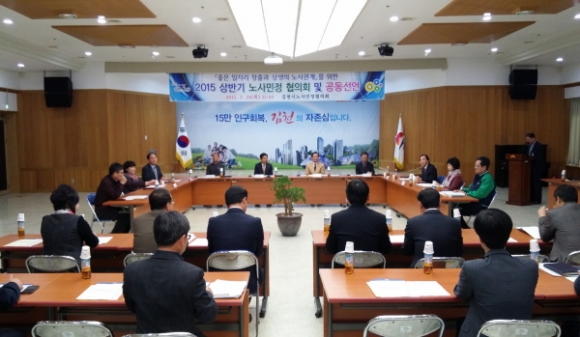 이번 회의는 노사정 공동선언문 협약식, 위원장 인사말, 2015 지역 노사민정 협력활성화 사업계획 설명, 노동시장 구조개선 설명 순으로 진행 되었다.