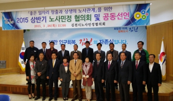 김천시 노사민정협의회(위원장 박보생)는 지난3월26일 김천시청 3층 강당에서 노사민정협의회 상반기 정례회를 개최하고『좋은 일자리 창출과 상생의 노사관계』정립을 위한 김천지역 노사정 공동선언문 협약을 체결하였다.