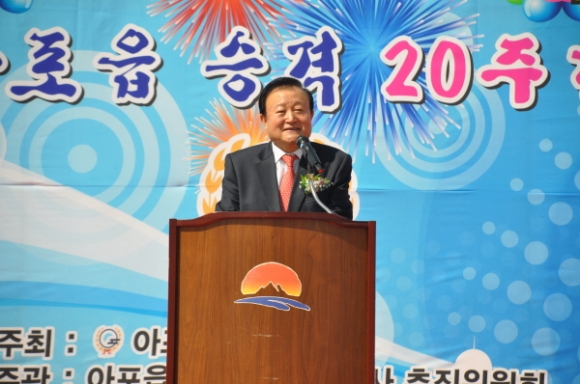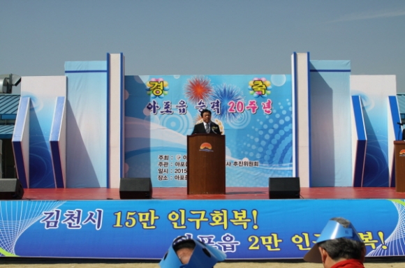 정해준 추진위원장은 기념사를 통해 읍민들과 추진위원회 위원들의 적극적인 협조에 먼저 감사의 말을 전하고 도농복합도시로 구미시와 인접해 있는 아포읍 인구증가 대책을 강조하고 친한경 농업단지 등 아포 개발을 위하여 다함께 힘을 모으자고 말하고 이 행사를 계기로 읍민들의 애향심과 자긍심을 고취시키고 아포읍 발전방향을 제시하였다.