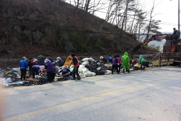 이날 부항면 사등2리 부녀회원 20여명은 본격적인 영농철로 바쁜데도 불구하고 자발적으로 참여하여 일제 수거한 영농 폐비닐과 일반 쓰레기 구분 작업을 실시하고 재활용 차량에 싣는 등 영농 폐비닐 정비를 위해 모두가 구슬땀을 흘렸다.