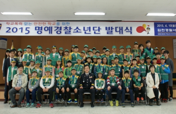 김천경찰서(서장 김훈찬)는 지난4월10일 4층 강당에서 「2015 명예경찰소년단 발대식 및 경찰서 견학 행사」를 개최하였다. 김천동부초등학교 등 지역 4개 초교 60명으로 구성된 명예경찰소년단은 교내 자치순찰 및 봉사활동 등을 통해 또래지킴이로서 1년간 활동하게 된다.